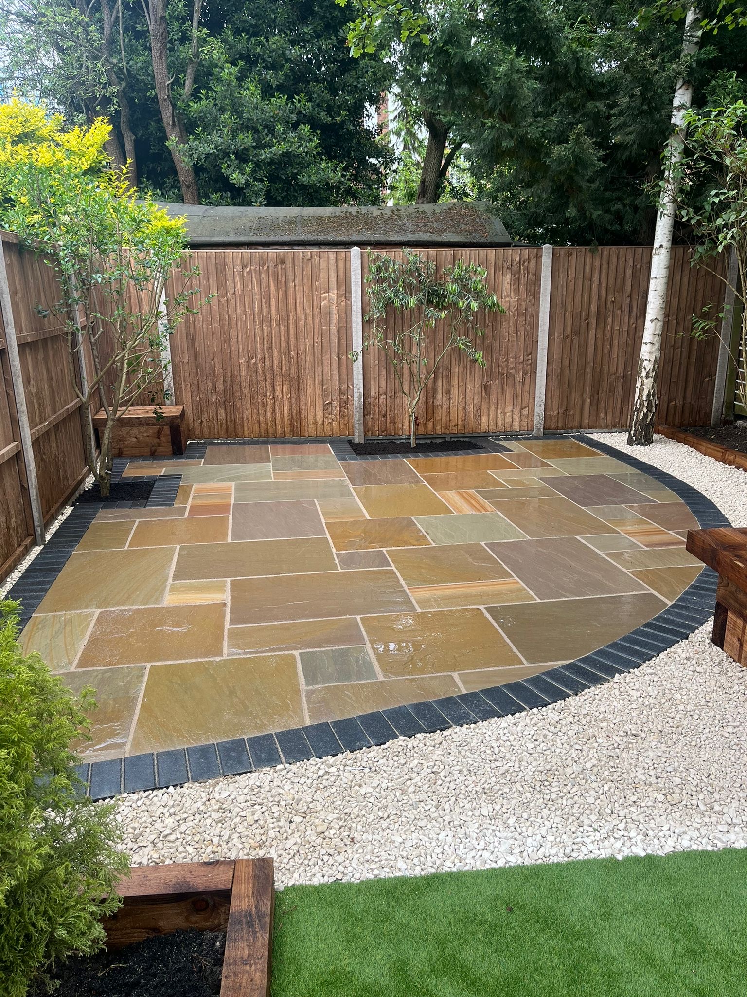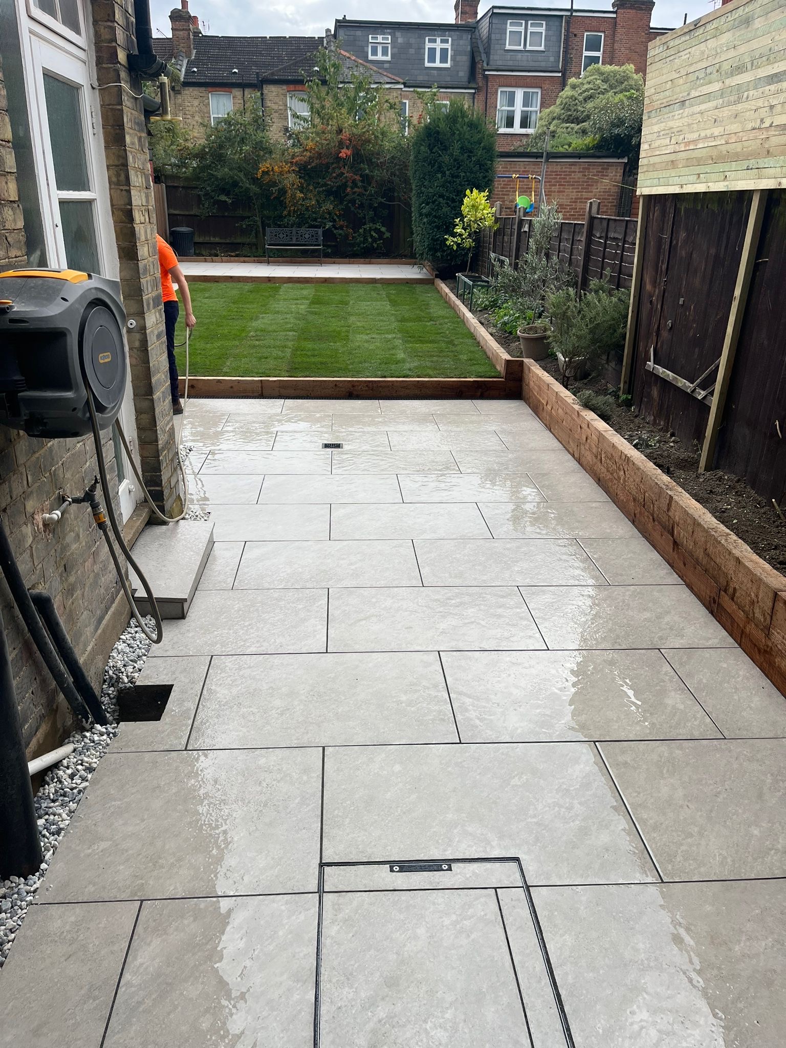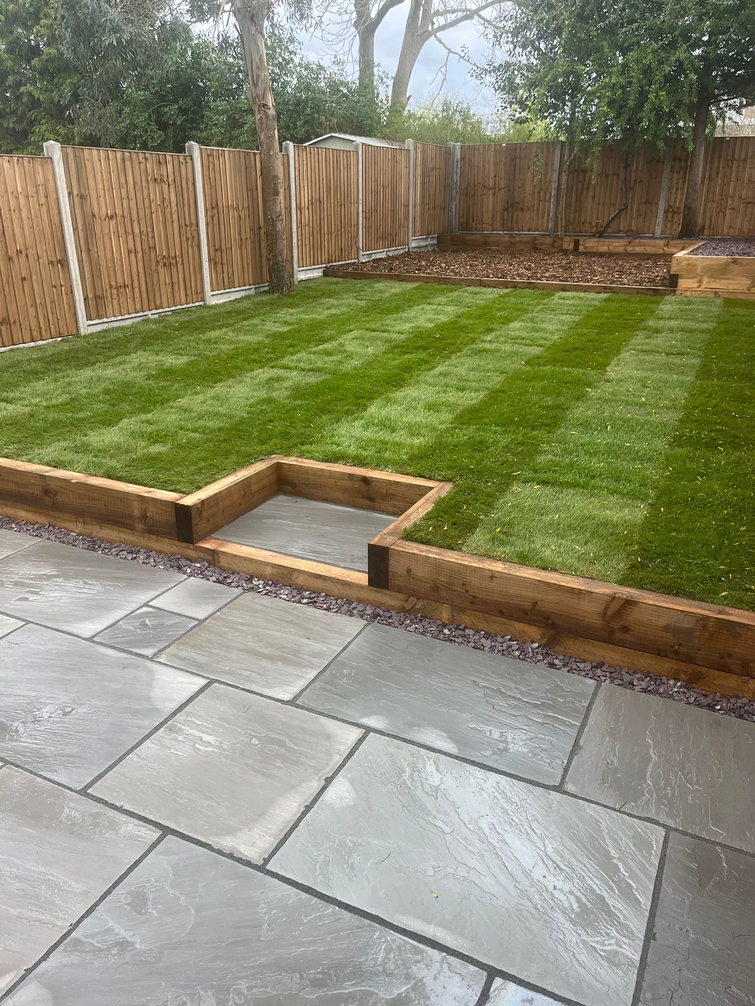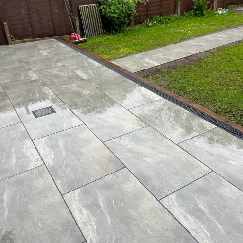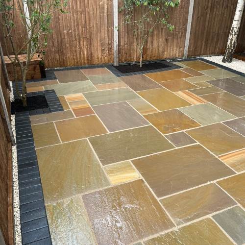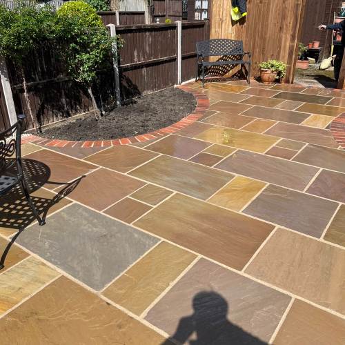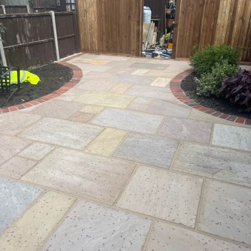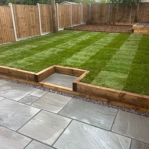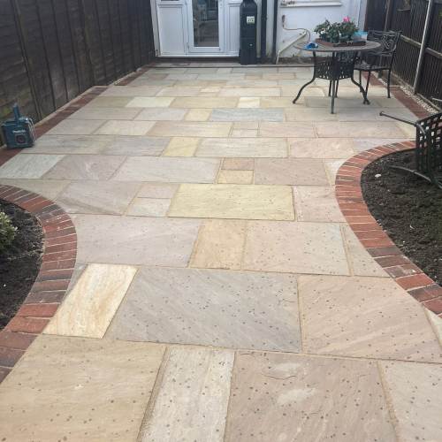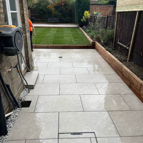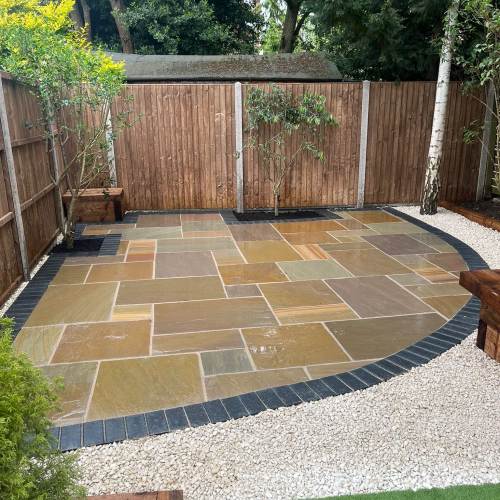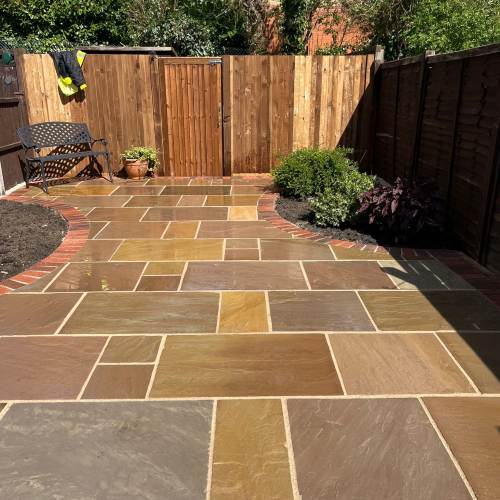 " Right from the initial quote to the snagging at the end, John Carey was professional, honest and reliable. His team (Mark, Ben and AJ) were hard-working and friendly. In a few days, my garden was transformed to look exactly how I wanted. The parking, access and the shape of my garden were all a challenge, but I was never made to feel it was too much trouble. John sorted out the level of the garden, lowering the level of the patio by the house to below the airbricks and adding drainage channels to a soakaway at the back. The sandstone pavers look great finished with Cotswold stone edging and timber sleeper raised borders. Thank you! "